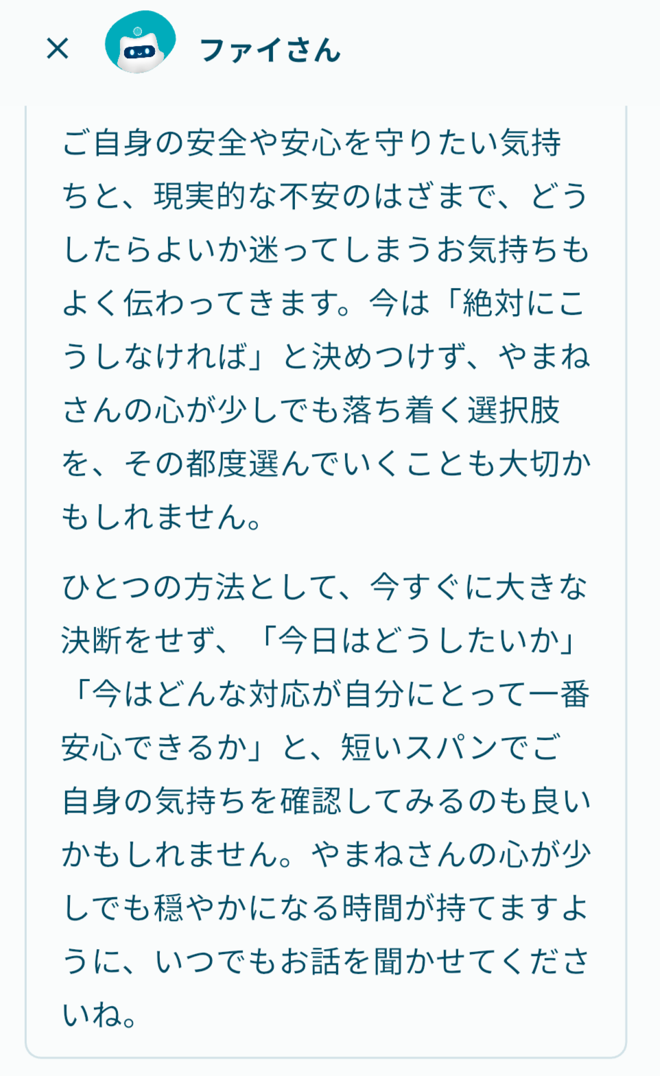 心の緊急事態の時に、AI機能のファイさんとのやり取りで、心が落ち着き、救われたという話です。