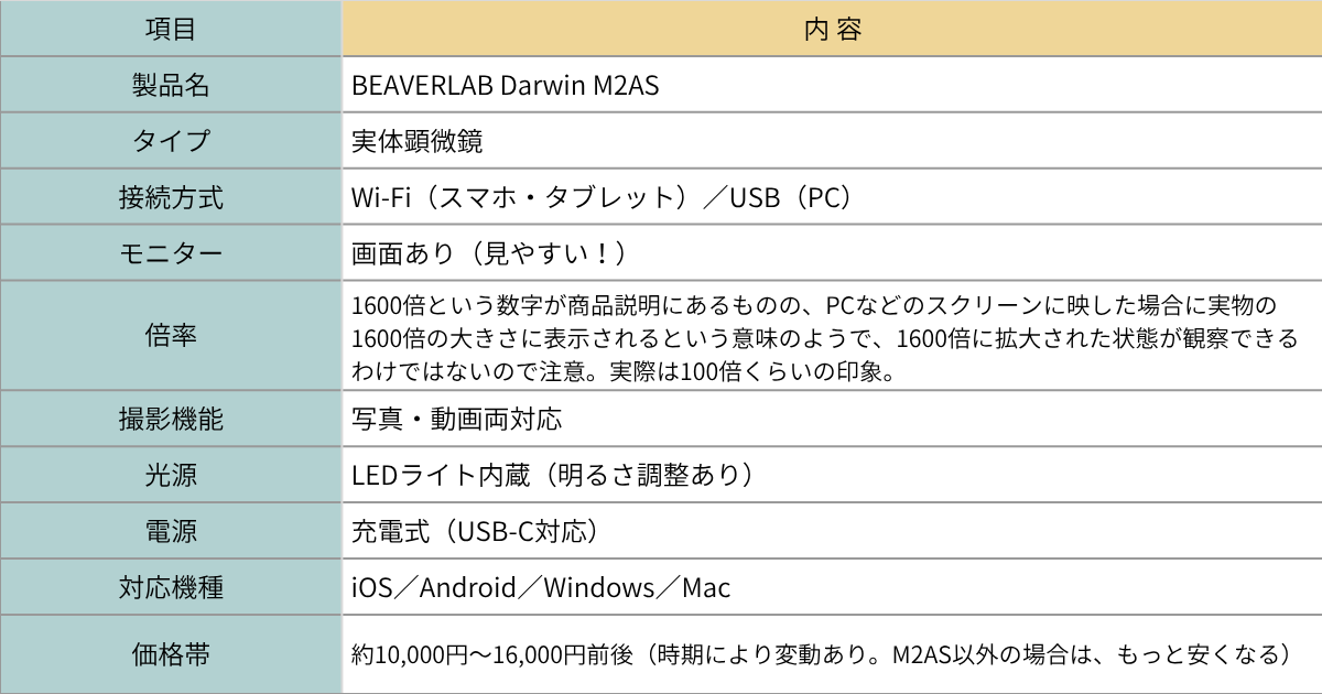 📊 今回紹介した顕微鏡「BEAVERLAB Darwin M2AS」のスペックまとめ