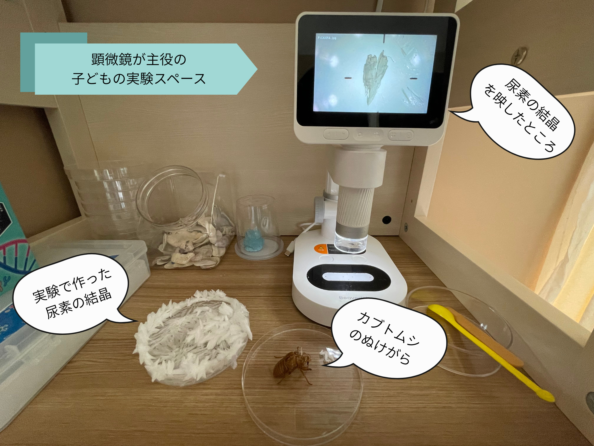我が家の顕微鏡はこんな感じで、子どもの科学系のグッズをまとめた小さなスペースの主役のようになっています。