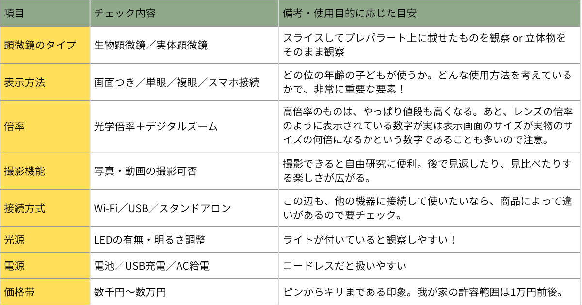 顕微鏡の購入時に比較検討すべきポイント一覧表