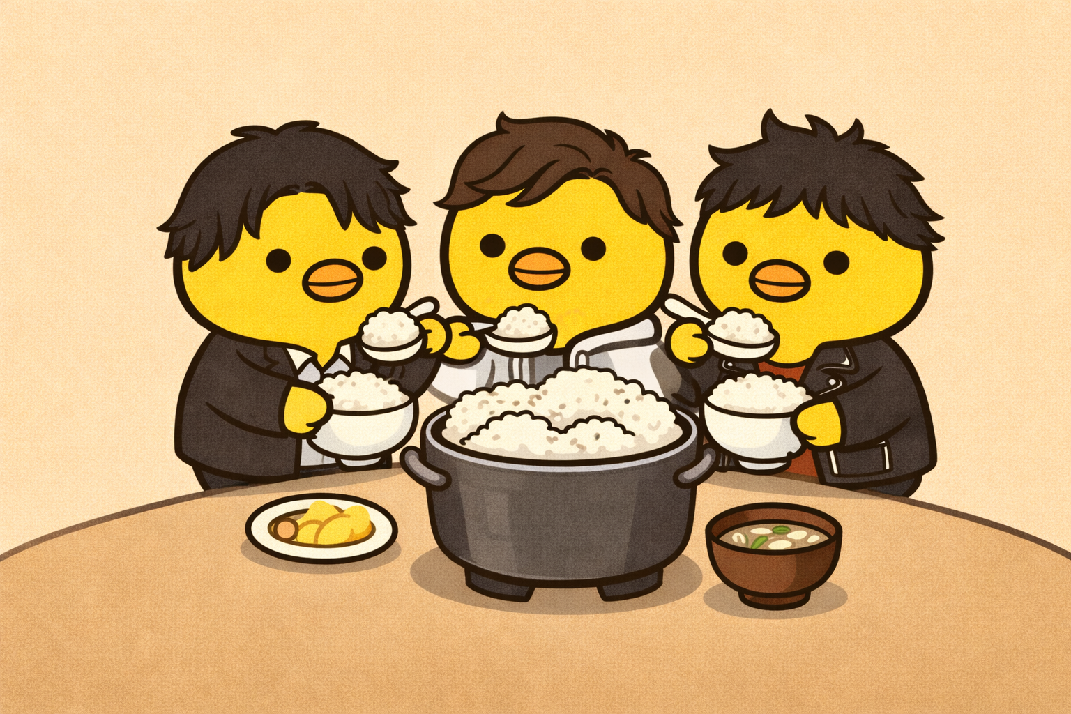 映画ではマモルとタクヤ、タクヤと梶谷がご飯を食べるシーンはありますが、3人でご飯を食べているシーンはないです😅
