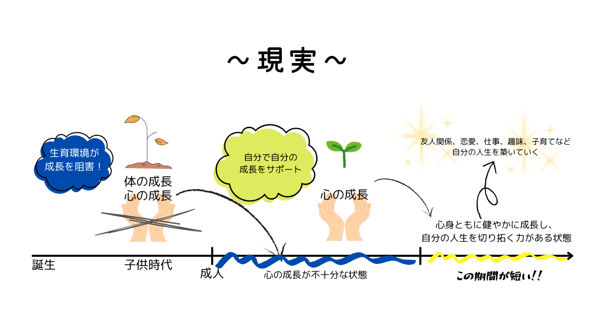 自分がアダルトチルドレンだと認識ている方にも本当に色々な方がいらっしゃると思うので、私の場合はということですが、「アダルトチルドレン」という名称通りに、体は大人に成長しているのに中身は幼児に近い状態のままという期間が長らくありました。